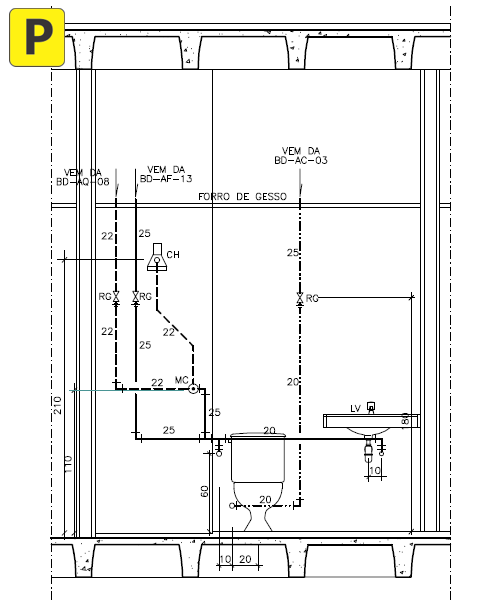 Veja a posição das peças sanitárias, dos registros de gaveta, os diâmetros das tubulações, os pontos de água, o local de passagem dos tubos. O projeto de detalhe deve ser seguido fielmente durante a execução da atividade.